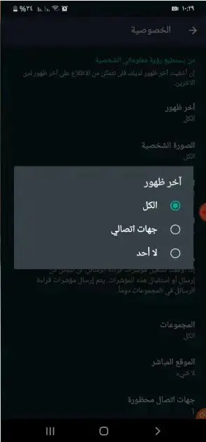 ثم ستجد أول خيار أخر ظهور ” Last seen” ، اضغط عليه واختر من القائمة لا أحد “Nobody”.
