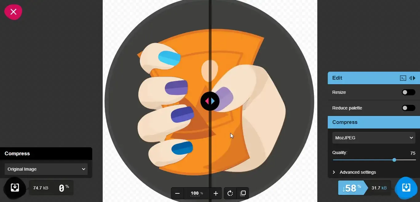 - سهولة إستخدام الموقع حيث يتميز موقع SQUOOSH بواجهة مستخدمة بسيطة تسهل لك العمل عليها .