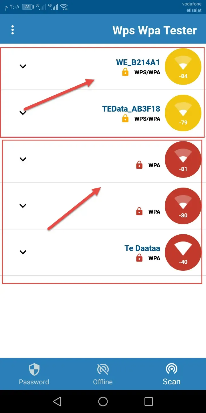 الشبكات التي تكون باللون الأصفر هي الشبكات التي تحتوي على ثغرة WPS وتكون قابلة للفتح ، أما الشبكات ذات اللون الأحمر تكون ذات حماية كبيرة وغير قابلة للفتح ، أما الشبكات ذات اللون الأخضر تكون أسهل الشبكات التي يمكن فتحها .