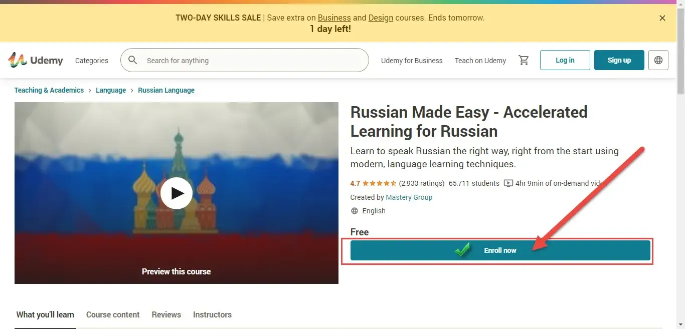 بعدما إستعرضنا أهم الأسباب لتعلم اللغة الروسية كل ما عليك الأن هو الدخول للرابط الذي سوف نضعه بالأسفل لتدخل علي منصة يودمي وتستطيع من خلالها تعلم اللغة الروسية بالصوت والصورة للمبتدئين من خلال كورس مجاني لتعلم اللغة الروسية من الصفر للاحتراف والذي سوف يضع لك أساس تعلم الروسية مجاناً .